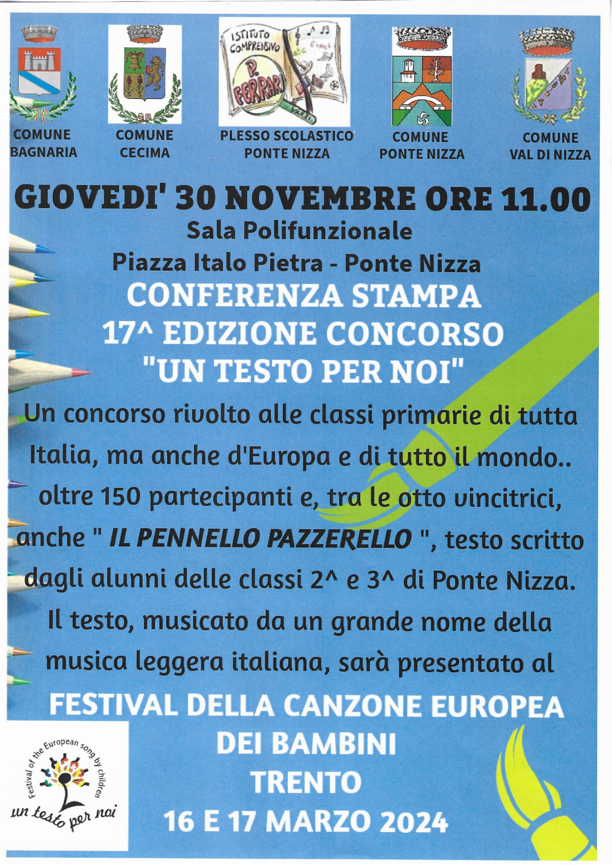 Descrizione Conferenza stampa 17^ edizione concorso "Un testo per noi" - 30 novembre 2023. Galleria fotografica Numero immagini: 1 Volantino Ultimo aggiornamento pagina: 08/02/2024 15:35:19