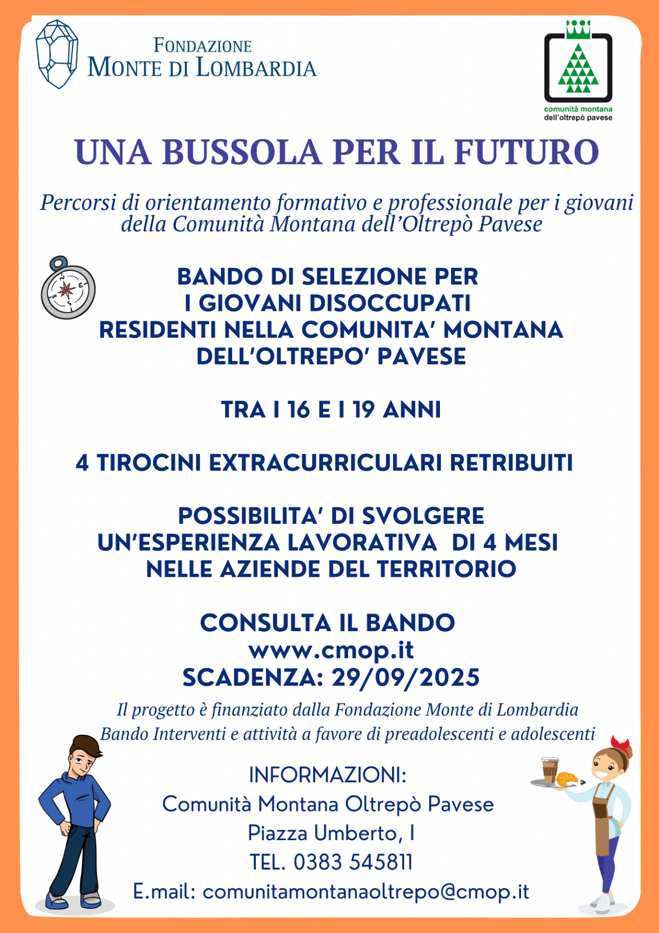 Avviso di selezione pubblica per l’attivazione di n. 4 tirocini retribuiti extra curriculari rivolti ai giovani tra i 16 e i 19 anni da svolgersi presso aziende del territorio della Comunità Montana dell’Oltrepo’ Pavese
