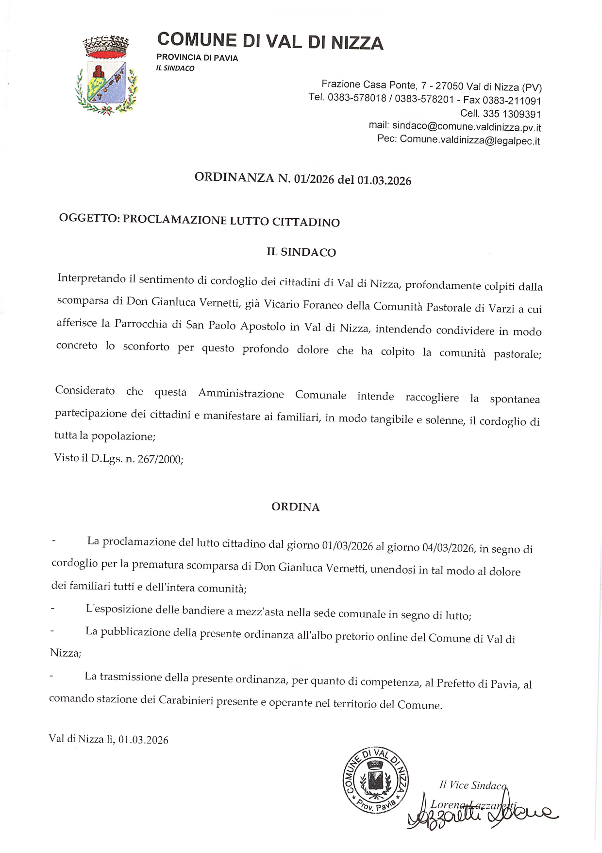 Proclamazione lutto cittadino dal 01.03.2026 al 04.03.2026 in segno di cordoglio per la prematura scomparsa di Don Gianluca Vernetti.