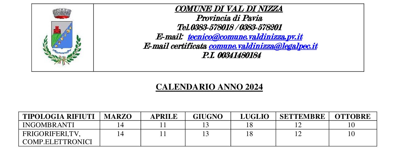 Descrizione Calendario raccolta rifiuti ingombranti 2024 Galleria fotografica Numero immagini: 1 Calendario Ingombranti Ultimo aggiornamento pagina: 08/02/2024 15:59:54